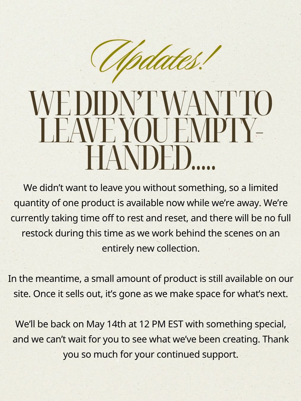 We’ll be back on May 14th at 12 PM EST with something special, and we can’t wait for you to see what we’ve been creating. Thank you so much for your continued support.
